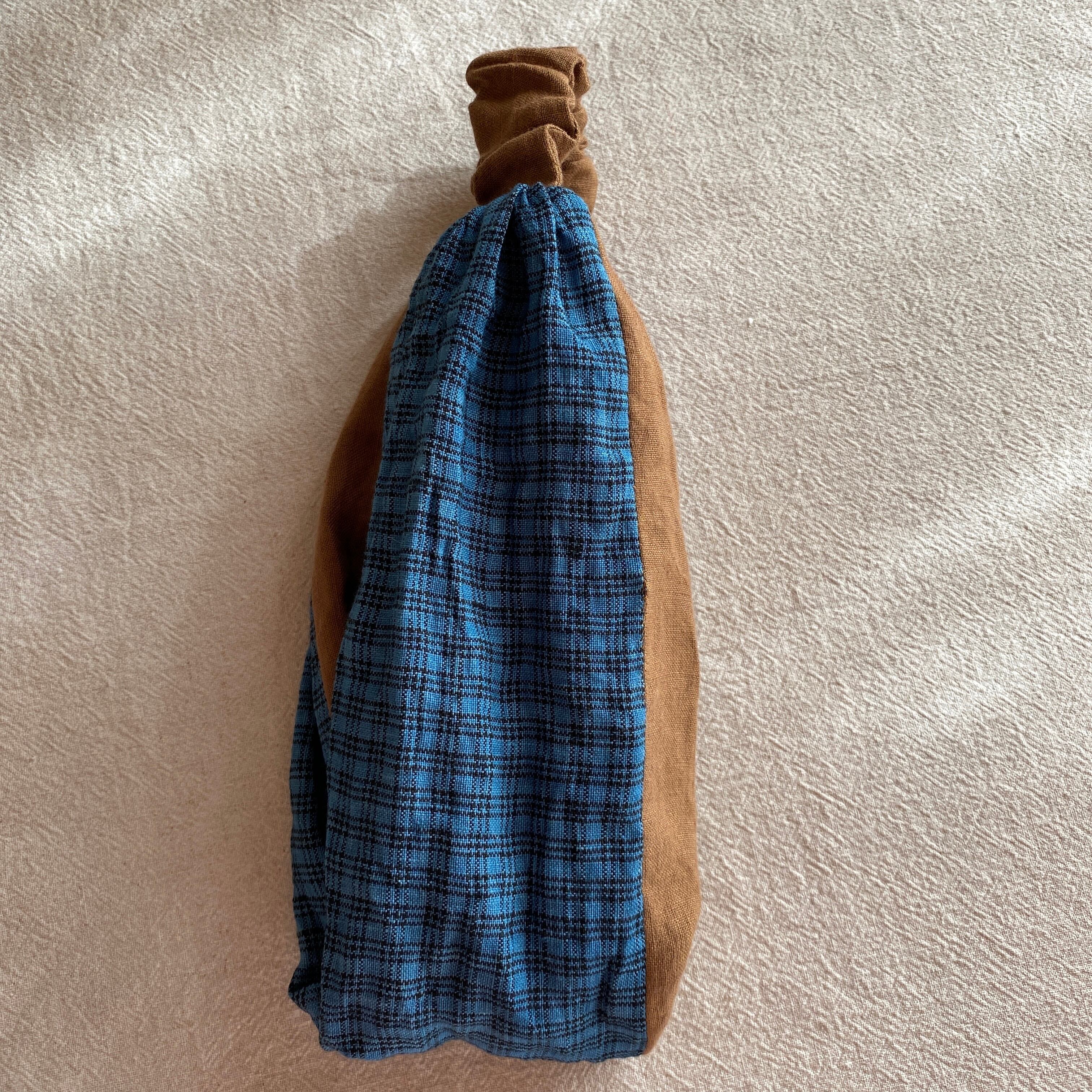 藍染めしたチェック柄リネンと国内で織りあげているリネン生地を使用しております。